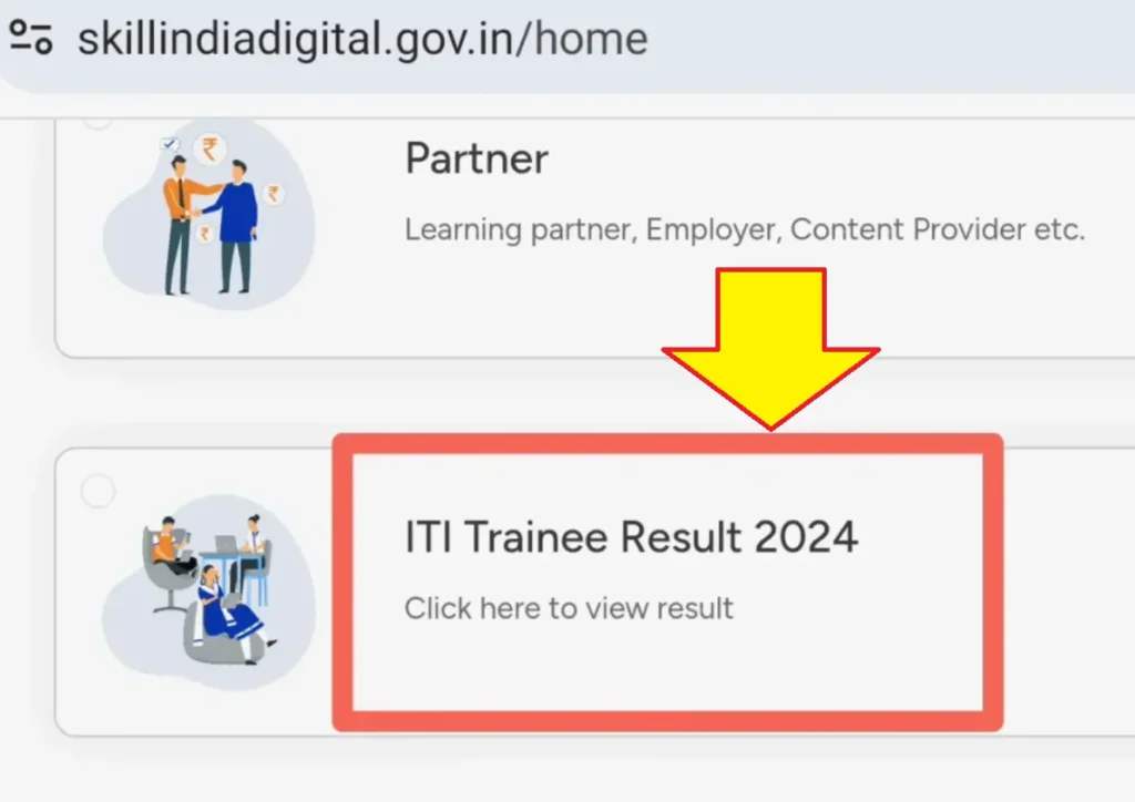 After logging in, you will see three options on the screen: ‘Learner’, ‘Partner’, and ‘ITI Trainee Result 2024’.